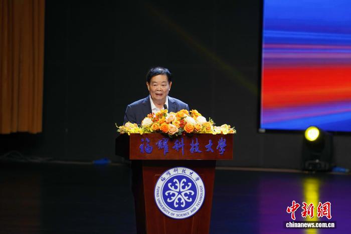 2025年,藤原科学技术大学的大学生开幕典礼在藤原科学技术大学的Minde Hall举行,于2025年举行。这张照片显示了藤雅科学技术大学董事会主席Cao Dewang在开幕式上发表演讲。提出福建科学技术大学的Photosione