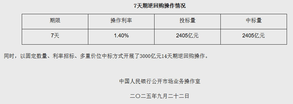 根据中国流行银行网站,中国新闻社于2025年9月22日,中国流行的银行进行了为期7天的反向购买业务,为2405亿元人民币,固定利率和数量优惠。