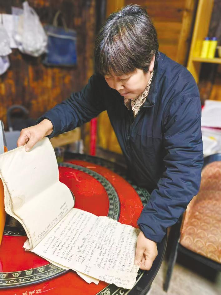 罗冠章的女儿李秀英向父亲展示了她退休返乡后写的一本日记。 (湖北日报全媒体记者陈一超供图)